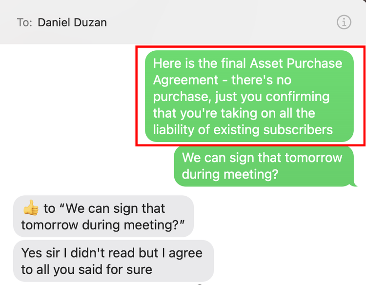 Discussion between Daniel and Dre. Dre provided Daniel with the Agreement as it had been discussed, making another note of the subscriber liability.