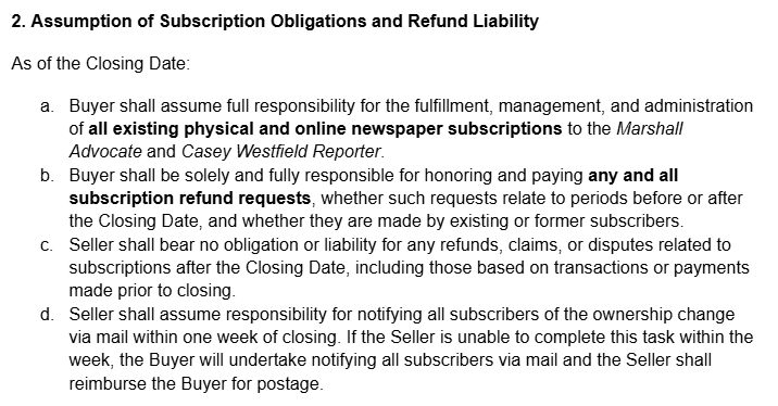 Our goal from the beginning was simple: allow the paper to continue without forcing my parents into further debt. In any subscription-based business, taking on existing subscriber liability is standard practice. Taking on a newspaper business is like buying a gym that already has members with active paid memberships. Even if the new owner hasn’t personally collected a single monthly payment yet, they still must honor the memberships or issue refunds — because the value of the business included those prepaid contracts. You can’t take ownership of the business, benefit from the existing subscriber base, and then deny the corresponding obligations.