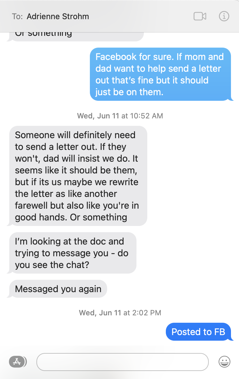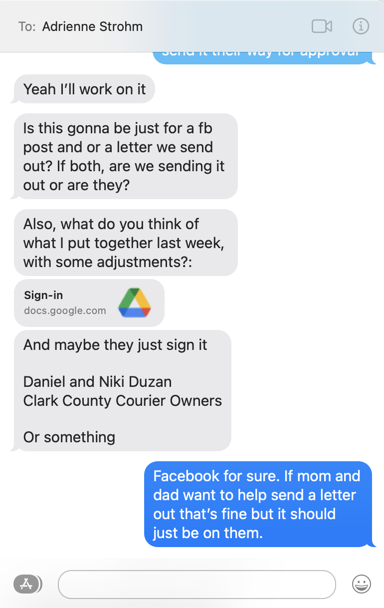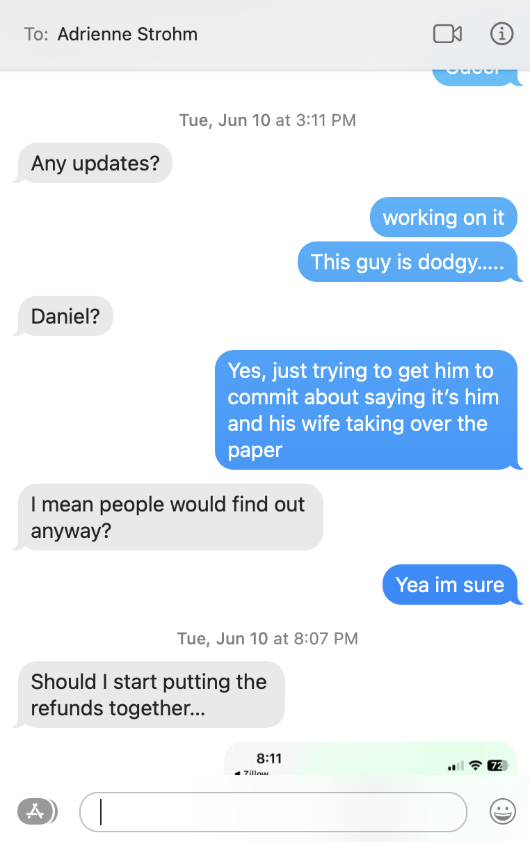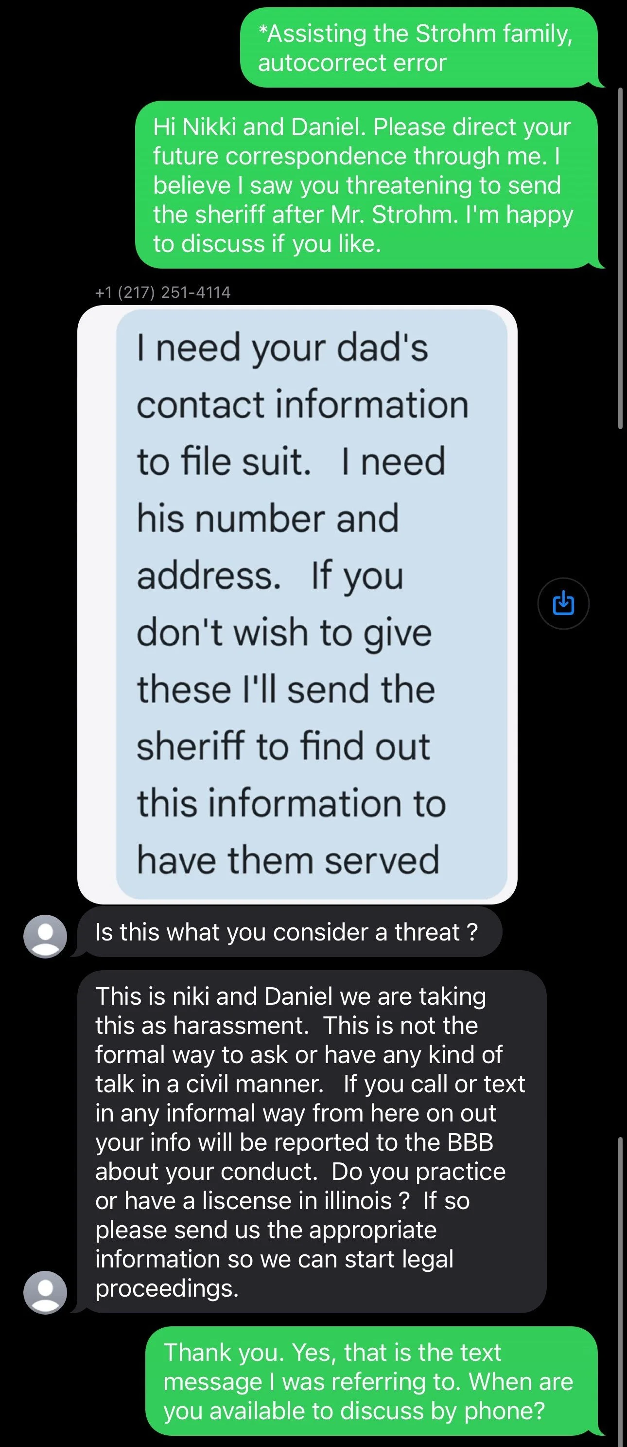 See below for further text message exchanges between other members of the Strohm family, Daniel Duzan, Niki Leinberger, and Stewart Rutledge (attorney).