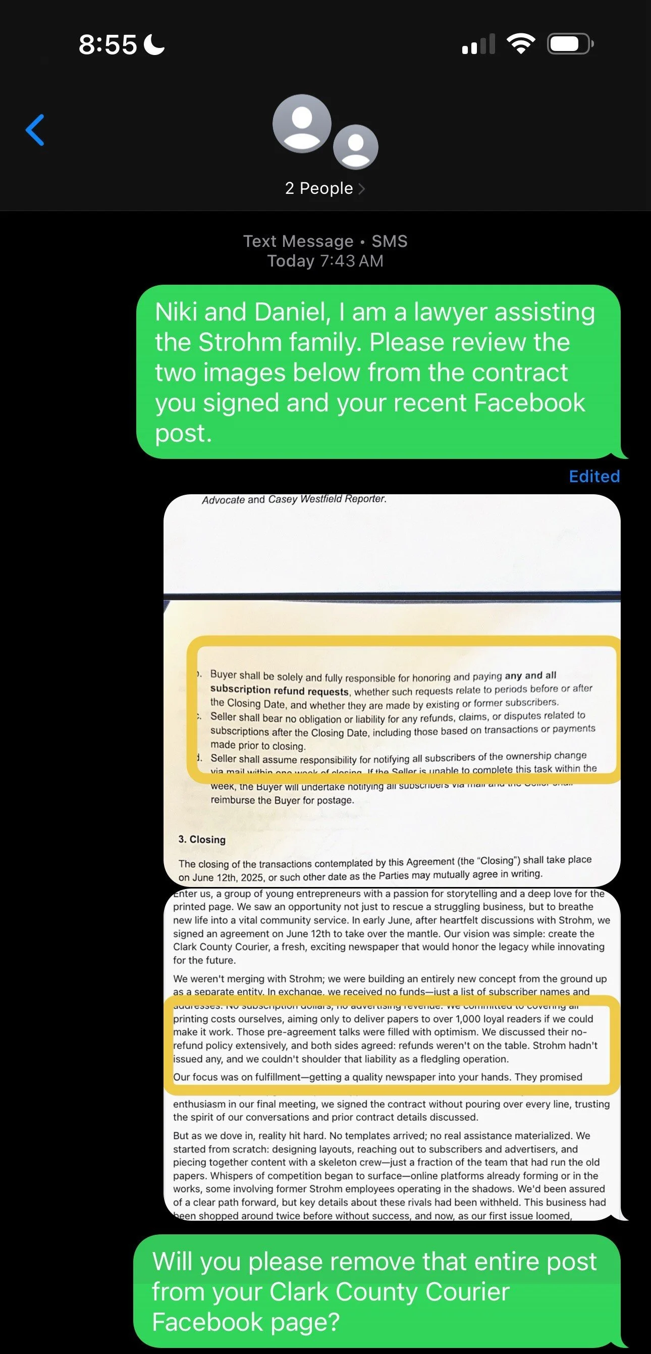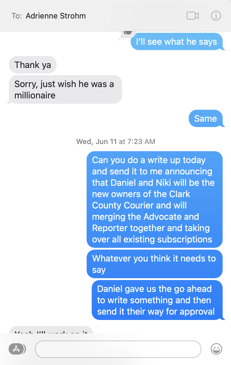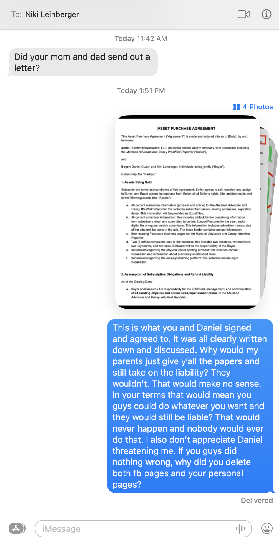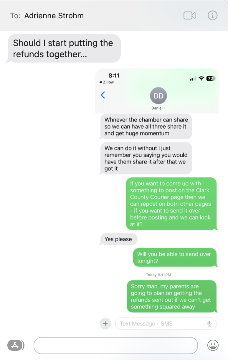 See below for further text message exchanges between other members of the Strohm family, Daniel Duzan, Niki Leinberger, and Stewart Rutledge (attorney).