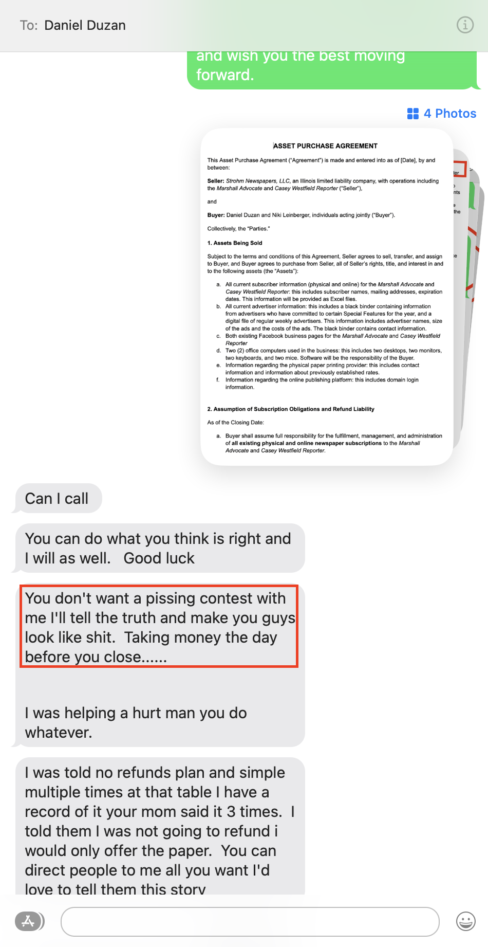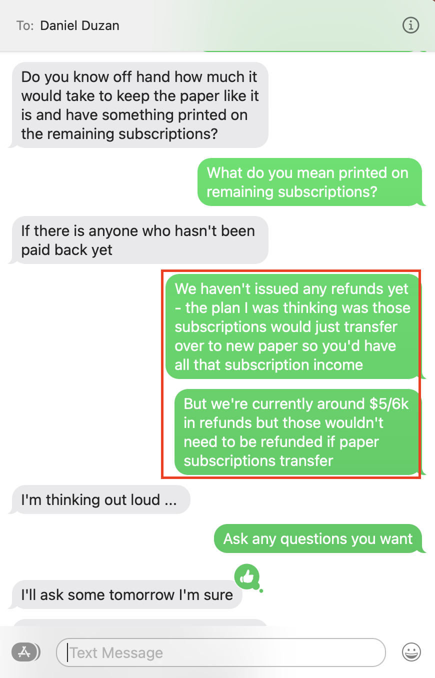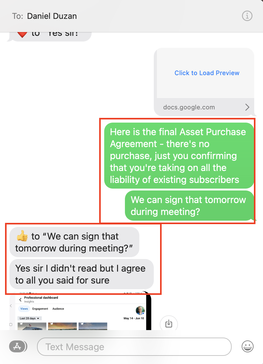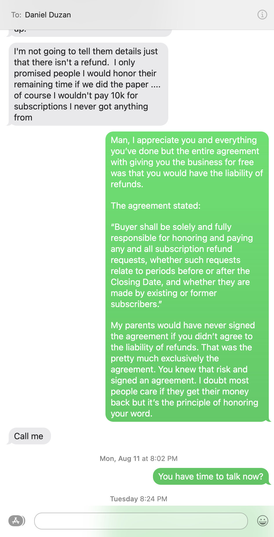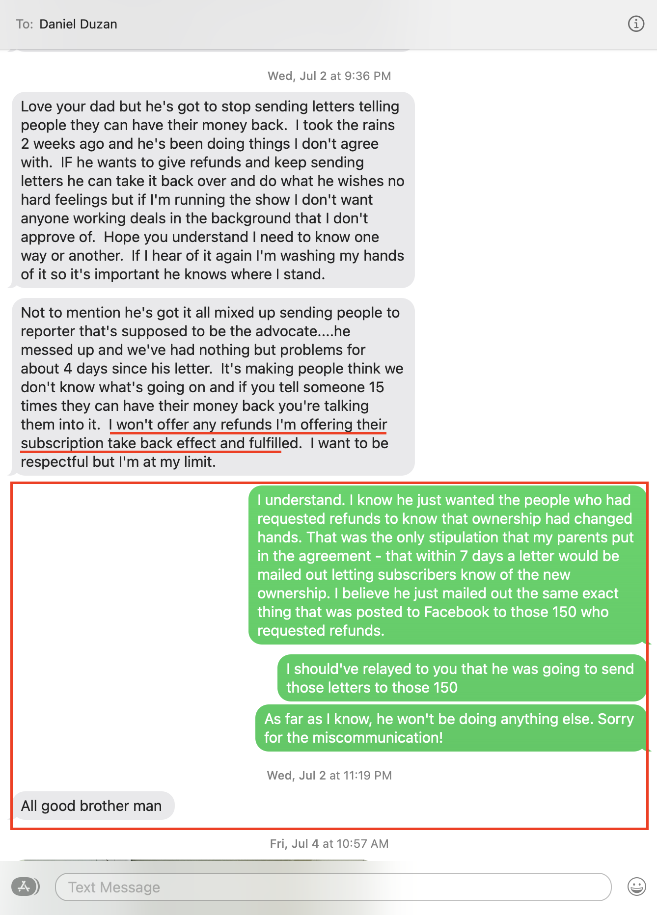 Highlighted texts between Daniel Duzan & Dre Strohm