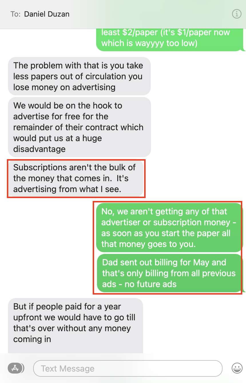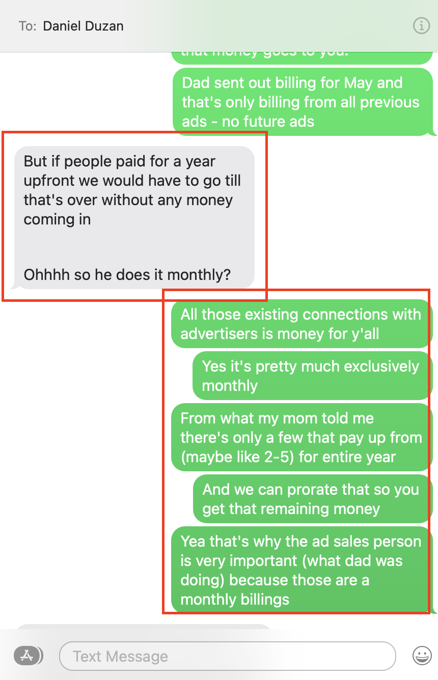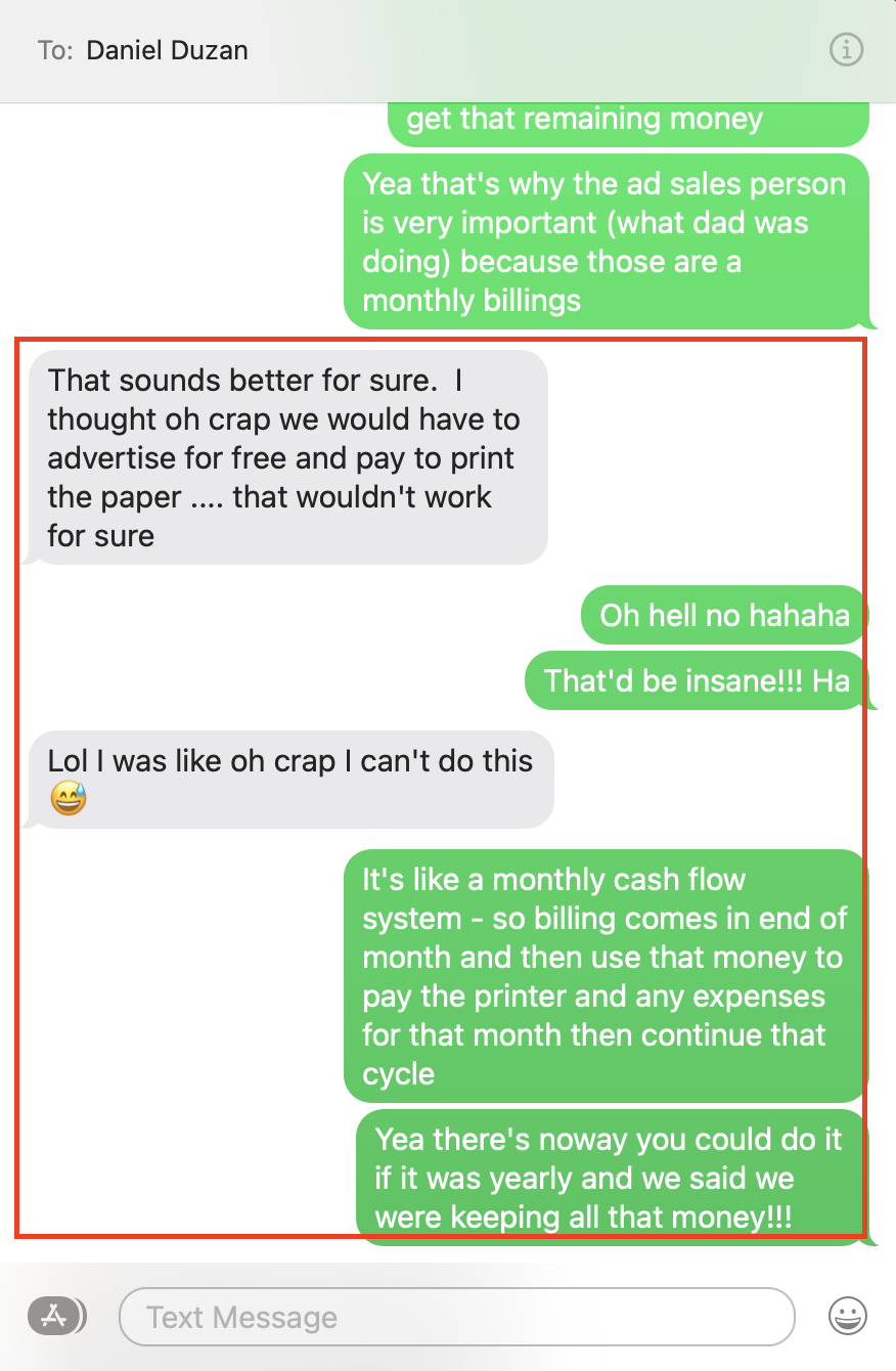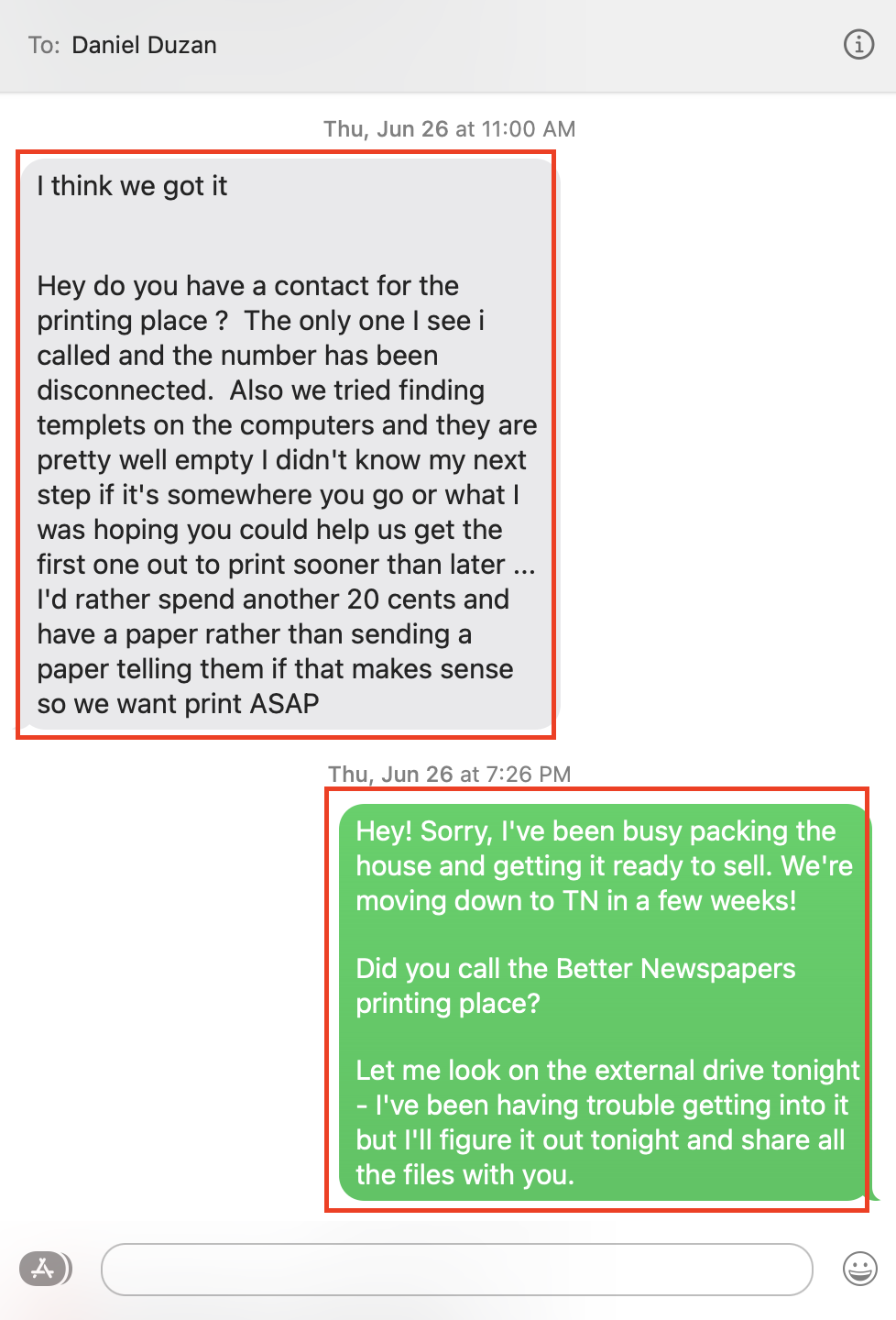 Highlighted texts between Daniel Duzan & Dre Strohm